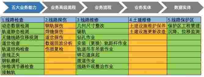 在轨道运维业务中,,,,,,,,,,,,,,我们形成了完整的从业务能力(业务域)-业务流程-业务实体-数据模型的分析梳理过程。。。。。。。。。。。。。轨道运维业务能力如下图所示:::::::::::