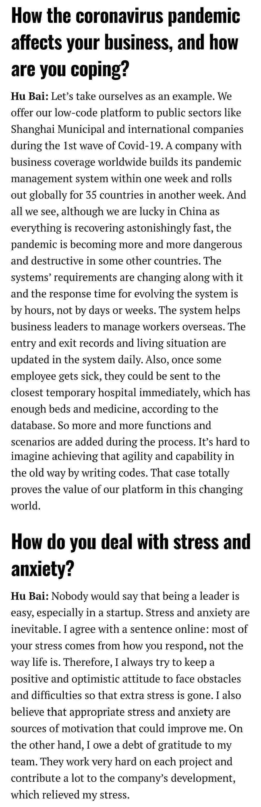 2021年年初,,,,,,,,爱湃斯科技CEO胡柏受邀接受法媒Startup.info的专访,,,,,,,,,,,,,与Startup info的读者分享了自己的创业经历、、、、、、、、、、、、、、、以及低代码平台NO钱包的创新之处。。。。。。。。。。
